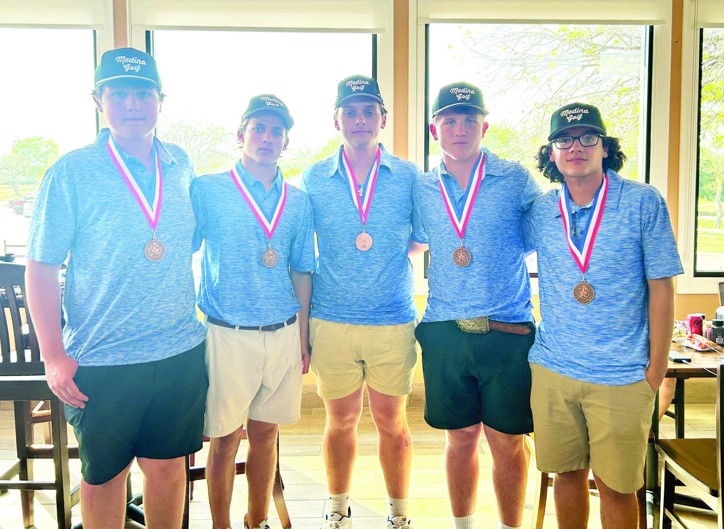 The Medina boys golf team competed at the District 31A Golf Tournament held at Flying L Ranch in Bandera on Wednesday, April 1. When the tournament was completed, Medina had secured a third place team finish. Sophomore JT Kunz advanced to the Regional Tournament as an individual and will play at ShadowGlen Golf Club in Manor on April 13th and 14th. Team members are Gaige Wherry, Davis Peterson, Ty Jones, JT Kunz, Tony Silva. Pictured with JT Kunz is Medina Golf Coach Aaron Taylor. COURTESY PHOTO