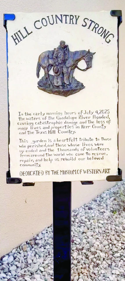A plaque at the Museum of Western Art’s Tribute Garden in Kerrville commemorates victims of the July 4, 2025 flood and honors first responders and volunteers who aided recovery efforts across the Texas Hill Country. BULLETIN PHOTO/ Daniel Tucker